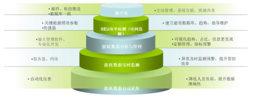 汽车企业能耗管理是指对生产/办公用电、用水、压缩空气、蒸汽等能耗的计量、归档、分析等管理。企业能耗数据管理的传统方式是人工抄表,抄表的数据再由工程师统计分析后转化为电子版,无法在过程中对能耗数据进行及时、有效的管控。(1)信息采集难:汽车制造是离散型工厂,设备类型多,存在多协议不兼容的问题;(2)单向供能管理:由于管理方式老旧,不能与生产过程建立联动;(3)数字化程度低:无法做到实时、精准了解各层级单位的用能情况,不能发现能源管理瓶颈,无法为能耗降准提供有利方法。亟需通过数字化的能耗管理方法来扭转汽车企业能源粗放式管理,实现精准管控、科学管控。因此,落地实施能耗数据监测与优化场景势在必行。汽车企业“能耗数据监测及优化”场景依托能耗管理系统实现整车或零部件企业生产/办公用电、用水、压缩空气、蒸汽能耗的实时计量、归档、分析及优化,助力汽车企业降低能源消耗、提高生产效率,实现企业的可持续发展。综合考虑能耗计量点位规模、建设类型(新建、改造)以及企业生产计划情况,汽车能耗数据监测与优化场景实施过程可参考如下步骤:(1)明确系统功能:能源管理系统可通过电脑无障碍访问;能耗异常消耗信息可通过邮件、短消息自动推送;企业级能耗报表一键生成;最终实现用能趋势时时更新直观展示。(2)明确系统边界及范围:明确能源计量类型、计量深度,最低应满足ISO50001能源体系要求。(3)设计能耗数据采集策略:为确保能耗计量网络的稳定性,根据各用能单位分布,设置集中子站点。(4)基于设定的系统架构和系统功能开发能耗管理系统。企业已有的软件基础或新建软件系统,应具备实现数据采集与处理、能源监控与分析、能源优化与调度、以及可视化展示的功能。1)计量表计:优先梳理各类能源计量网络图、能流图,根据提前策划好的计量网络图,明确计量仪表配置明细,采购、安装能耗数据采集仪表,仪表计量精度满足国标要求。2)数据服务器:根据能耗数据采集频次、数据存储、用户访问处理能力,配置能耗管理服务器,且服务器软/硬件配置需满足企业信息安全策略需求。3)网络系统:根据工厂用能点位分布范围,设置区域数据边缘服务器,包含智能表计上的采集模块、无线信号接收模块、交换机、边缘设备等。1)各用能单位能流图应该清晰、明确,在能耗系统中对基础能耗数据底层逻辑进行设定,并可根据需求进行调整。2)能耗数据应呈现出明确的层级关系,可利用层级间的数据来验证计量数据准确性。