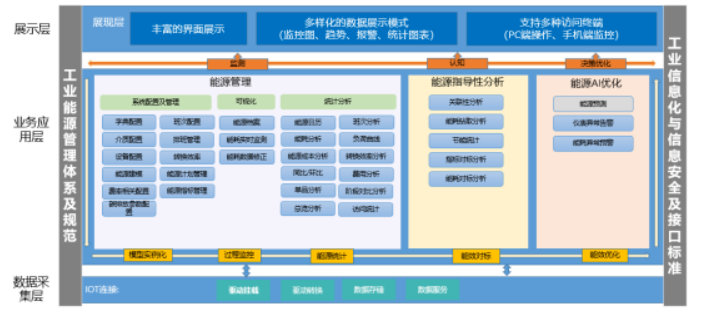 机械九院通过搭建智能工厂能源管理与优化系统为汽车企业提供一套可行的、环保的、高效的能源管理解决方案,主要内容包含数据采集与分析模块、能源管理系统、智能决策支持系统、系统集成与优化模块等。(1)数据采集与分析模块:通过各类传感器、监测设备实时采集工厂内的生产数据、能源消耗数据等,通过大数据分析技术对这些数据进行挖掘和分析,为后续的能源管理与优化提供数据支持。(2)能源管理系统:基于数据采集与分析结果,搭建能源管理系统,实现对工厂内各类设备的能源消耗进行实时监控、预测和优化调度,降低能源消耗,提高能源利用效率。(3)智能决策支持系统:引入人工智能技术,为能源管理系统提供智能决策支持,包括能源消耗预测、设备运行优化建议等,帮助企业实现精细化管理。(4)系统集成与优化:将上述各个部分有机结合,形成一个完整的智能工厂能源管理与优化系统,实现系统间的无缝集成和协同工作,为企业提供全方位的能源管理解决方案。(1)软件架构:能源管理与优化系统的软件架构主要包括数据采集层、业务应用层和展示层,如图4所示。