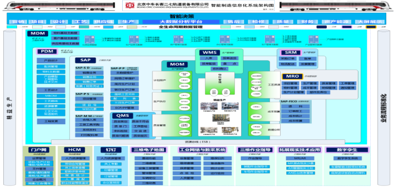 组装产线建成3条车辆装配产线、1个线缆自动化集成产线、1个管路自动化加工产线的“3+1+1”组合方案,整车轮式运输车、单车淋雨、四点称重、智能拧紧等设备均达到行业领先水平。实现城铁车辆预制、预组、装配全工序制造的集中处理。转向架生产线将“解、检、修、装”集成一体,细分为转向架分解、构架解修、轮对解修、构架组装、轮对组装、转向架组装6个作业模块,兼具各型转向架制造能力。其中轮对压装机、车轮静平衡测量机、轮对动平衡测量机、轮对测量机、跑合实验台、构架装配自动线、静压试验台等均为行业领先水平。信息化建设以顶层设计、信息贯通、数据治理为建设原则,将精益生产、智能制造的理念与先进信息技术相融合,已经建立起以SAP为核心,PDM、QMS、MOM、WMS、SRM等系统为支撑的信息化系统平台,进一步打通设计、工艺、质量数据流,重塑生产执行、物流及仓库管理数据流,实现“管理规范化、规范流程化、流程信息化”的三化合一。
